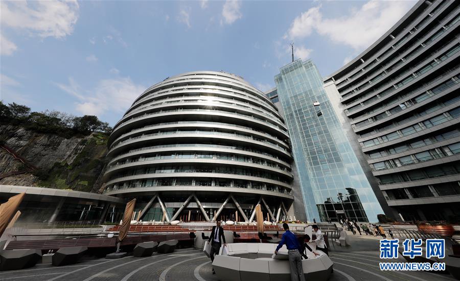 工作人員在礦坑底部的酒店親水平臺布置座椅(11月13日攝)。 位于上海松江的世茂洲際酒店11月15日正式開門營業(yè)。這家在一個廢棄采石礦坑內(nèi)建成的酒店成為上海又一新景。 新華社記者 方喆 攝