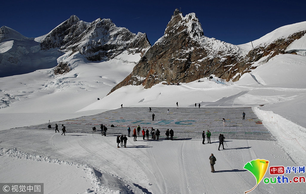 這是11月16日拍攝的瑞士少女峰下阿萊奇冰川上的世界最大明信片。一張面積約2500平方米的世界最大明信片16日在瑞士少女峰下正式亮相,旨在喚起人們對(duì)全球氣候變化的關(guān)注。這張明信片的尺寸打破吉尼斯紀(jì)錄。新華社記者徐金泉攝