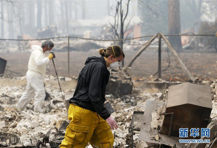11月18日,在美國加利福尼亞州比尤特縣天堂鎮(zhèn),救援人員在山火廢墟中工作。 新華社記者吳曉凌攝