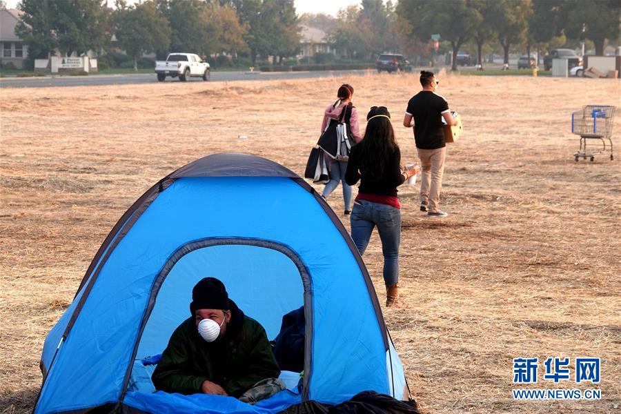 11月18日,在美國(guó)加利福尼亞州比尤特縣奇科,災(zāi)民在沃爾瑪停車場(chǎng)搭起帳篷暫居。  新華社記者吳曉凌攝