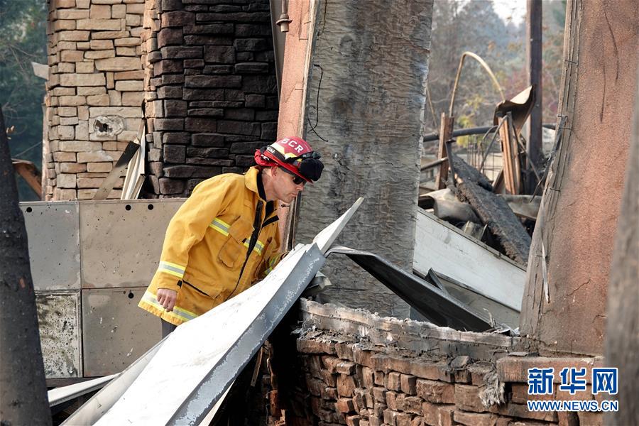 11月18日,在美國(guó)加利福尼亞州比尤特縣天堂鎮(zhèn),一名消防人員查看廢墟。 新華社記者吳曉凌攝