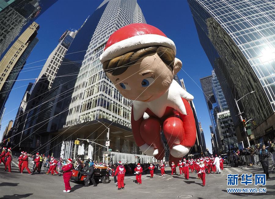 11月22日,在美國紐約感恩節(jié)大游行上,小精靈造型氣球行進在曼哈頓街頭。