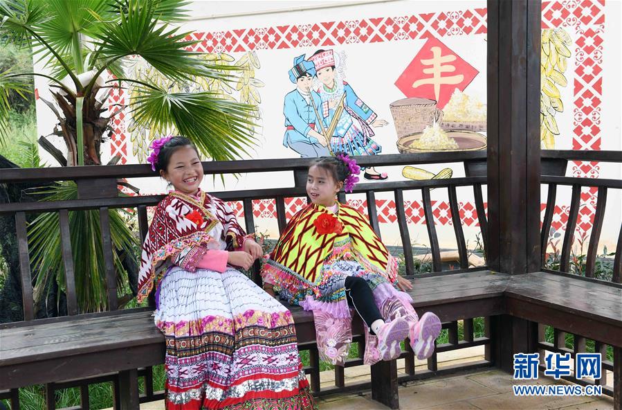在尋甸回族彝族自治縣塘子街道小海村,兩名小女孩在村里的休閑亭玩耍(9月30日攝)。國慶節(jié)期間,云南省尋甸回族彝族自治縣塘子街道小海村一片喜慶祥和。人們身著節(jié)日盛裝,載歌載舞,歡慶搬入新居后的第一個國慶節(jié)。新華社記者楊宗友攝