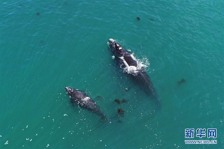 9月30日,在南非赫曼紐斯小鎮(zhèn)附近海面上,2頭南露脊鯨在海岸邊暢游。9月29日,位于開普敦以東約115公里的赫曼紐斯小鎮(zhèn)迎來2018年的鯨魚節(jié),來自世界各地的游客可乘船出海觀鯨,也可在岸邊等待鯨魚的到來。新華社記者陳誠攝