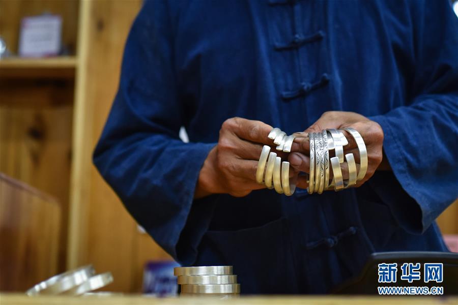 8月3日,唐白梅展示自己在龍懂陽(yáng)的銀飾店里制作的銀鐲子。