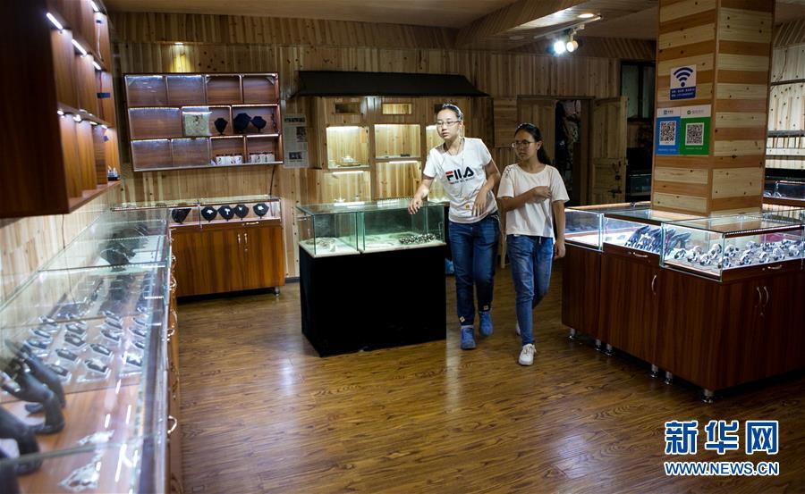 8月3日,前來(lái)體驗(yàn)銀飾制作的青少年參觀龍?zhí)?yáng)的銀飾陳列展臺(tái)。