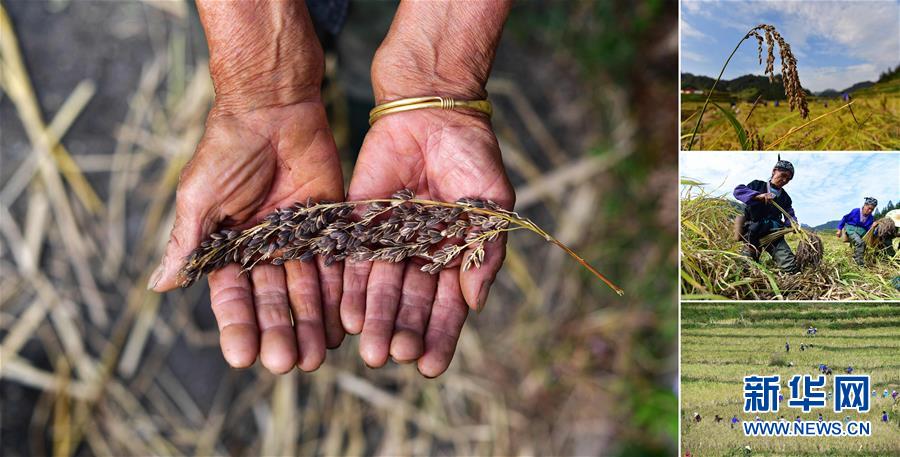 拼版照片:左圖為在安太鄉(xiāng)元寶村,80歲的賈榮專手捧剛剛收獲的香糯;右上圖為成熟待收的香糯;右中圖為賈榮專(左)在收割香糯;右下圖為村民們在收香糯(照片均攝于10月30日)。2017年,賈榮專加入村里的香糯種植合作社。香糯是廣西融水大苗山的特產(chǎn),它生長在高寒高海拔的特殊自然環(huán)境中,產(chǎn)量少,營養(yǎng)價值高。 廣西融水苗族自治縣是國家扶貧工作重點縣,全縣“九山半水半分田”,生活生產(chǎn)環(huán)境較為惡劣,脫貧攻堅任務艱巨,目前還有7.68萬貧困人口。面對經(jīng)濟發(fā)展落后、貧困面廣且程度深的現(xiàn)狀,當?shù)匕衙撠毠耘c創(chuàng)新產(chǎn)業(yè)扶持相結(jié)合,依托生態(tài)資源優(yōu)勢,實施“特色產(chǎn)業(yè)富民行動”,通過發(fā)展特色民族旅游、林下經(jīng)濟和特色養(yǎng)殖業(yè)等扶貧產(chǎn)業(yè),帶動貧困群眾依靠勤勞的雙手,拔窮根摘窮帽,實現(xiàn)脫貧致富。據(jù)了解,目前全縣貧困戶參與特色產(chǎn)業(yè)發(fā)展的有2.9萬戶,扶貧產(chǎn)業(yè)覆蓋率達95%。 新華社記者 黃孝邦 攝