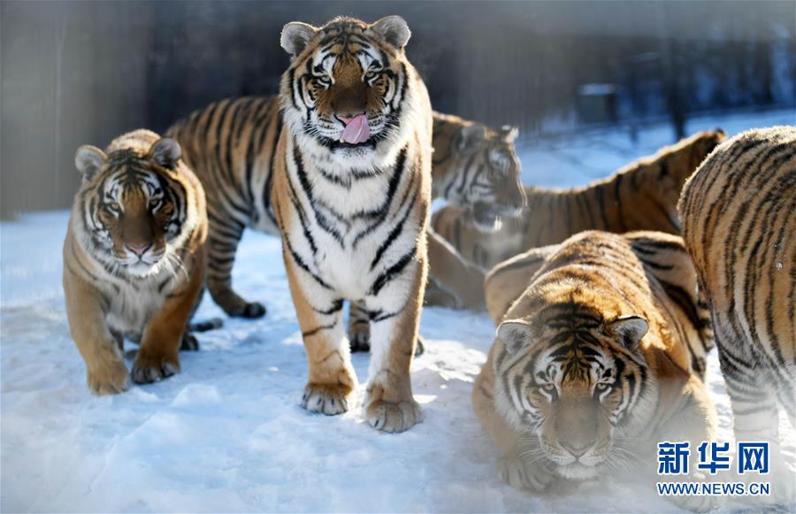 在橫道河子東北虎林園散放區(qū),幾只東北虎在雪地上休息(11月21日攝)。