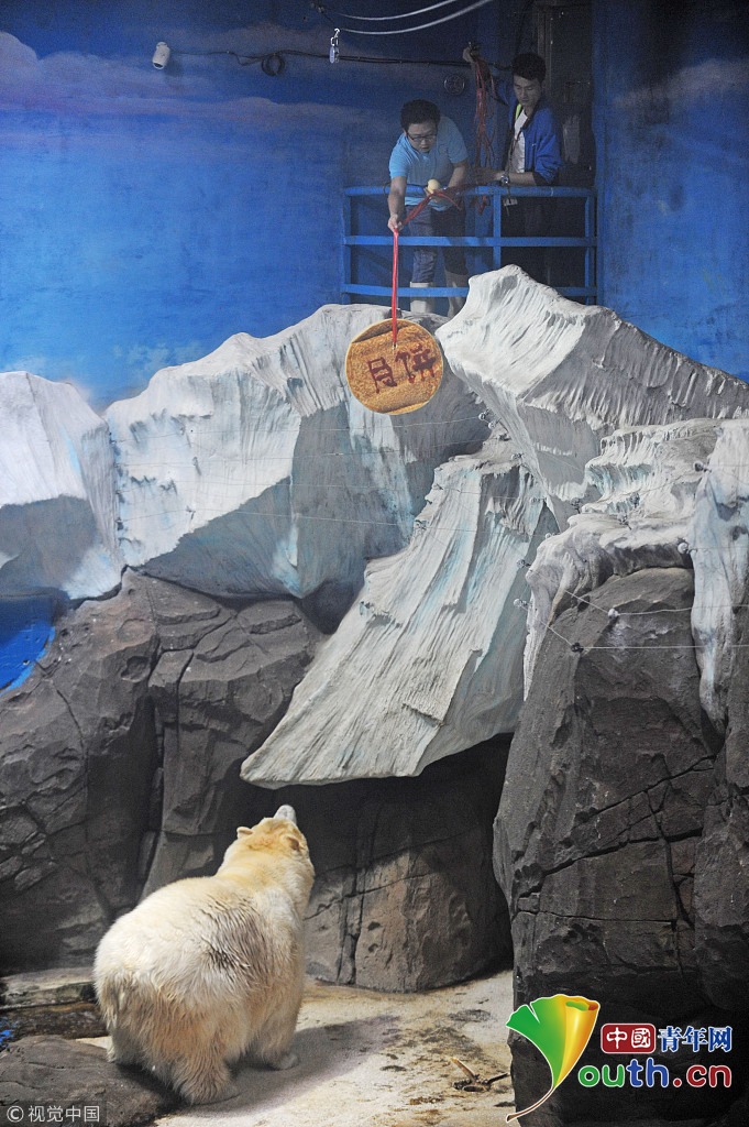 2017年9月29日,武漢海昌極地海洋公園里,北極熊“靜靜”翹首以盼為自己準備的“專屬月餅”。