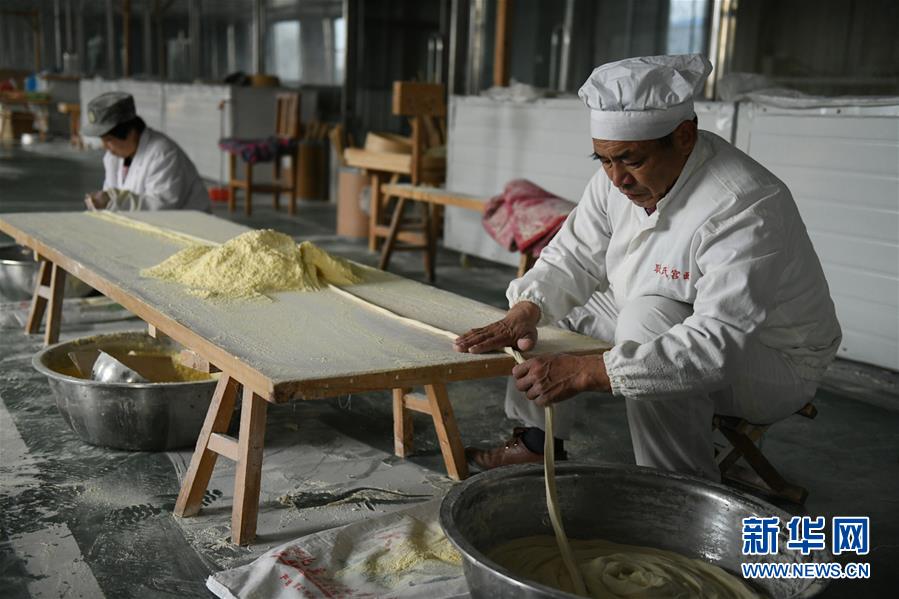 11月23日,在石家莊市藁城區(qū)耿家莊村某宮面生產(chǎn)廠,工人在搓條。