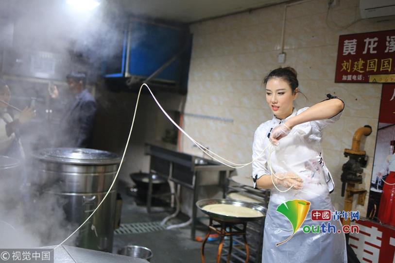 2018年11月19日,成都,繼“妖嬈拉面哥”之后,黃龍溪古鎮(zhèn)一個(gè)身材高挑的古裝美女,一邊跳舞一邊揮甩著手中的面條被贊“甩面仙子”走紅網(wǎng)絡(luò)。圖片作者:紅葉/視覺(jué)中國(guó)