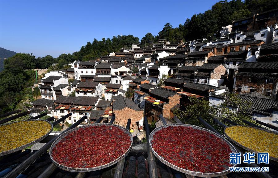 2017年10月26日拍攝的篁嶺古村。家家戶戶晾曬各種蔬果及皇菊。近日天氣晴朗,江西省婺源縣江灣鎮(zhèn)篁嶺村村民抓住時(shí)機(jī)采摘、晾曬皇菊及蔬果。明黃的菊花、火紅的辣椒……各種顏色將篁嶺古村裝扮成巨大的“調(diào)色板”,引來(lái)眾多游客感受鄉(xiāng)村美景。新華社記者宋振平 攝