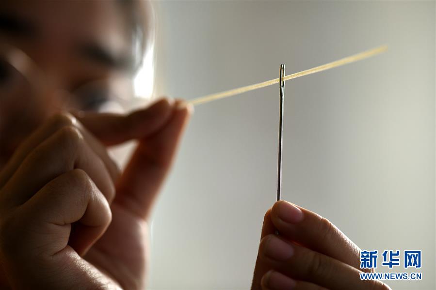 11月23日,在石家莊市藁城區(qū)耿家莊村某宮面生產(chǎn)廠,工人演示用藁城宮面穿過(guò)縫針眼。
