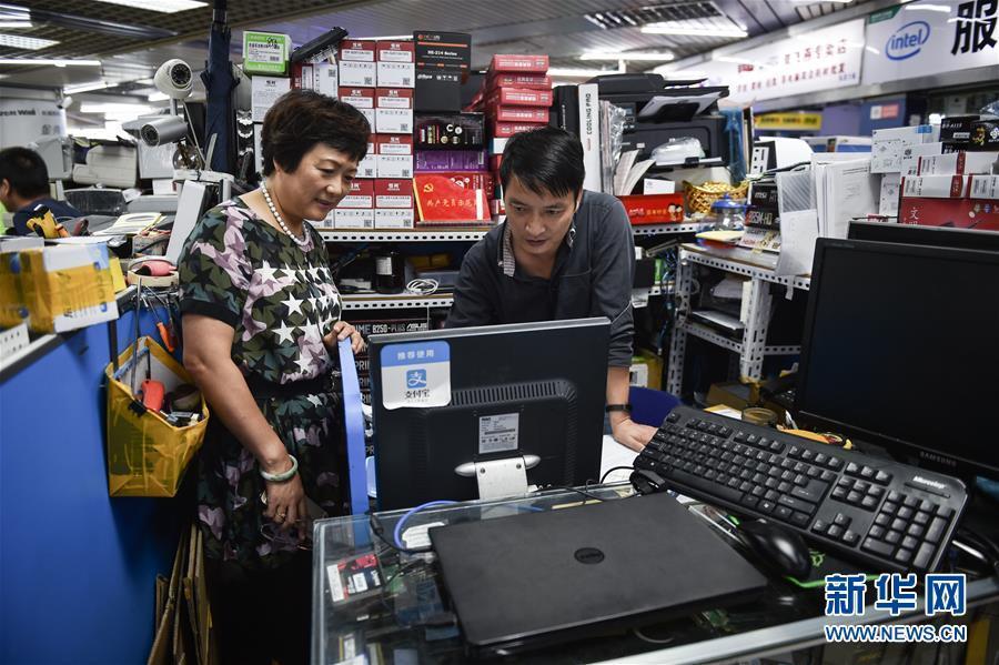 倪海真(左)到深圳華強(qiáng)北賽格電子市場(chǎng)五層的支部宣傳委員陳亞林柜臺(tái)前,與他溝通近期支部黨員學(xué)習(xí)的情況(2017年9月5日攝)。新華社記者毛思倩 攝 圖片來源:新華網(wǎng)