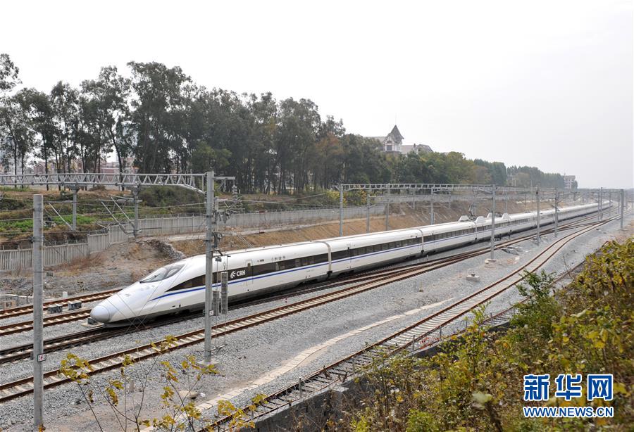 廣西桂林至北京高鐵列車在桂林市靈川縣境內(nèi)行駛(2013年12月28日攝)。 廣西壯族自治區(qū)成立60年來,鐵路建設(shè)發(fā)生翻天覆地的變化。來自中國(guó)鐵路南寧局集團(tuán)有限公司的數(shù)據(jù)顯示,1958年廣西鐵路總里程為1346.3公里,如今廣西鐵路總里程達(dá)5191公里。廣西與周邊相鄰省份間實(shí)現(xiàn)動(dòng)車“公交化”開行。此外,北部灣港—重慶班列、東盟海產(chǎn)品冷鏈班列、“百色一號(hào)”果蔬專列等的開通和運(yùn)營(yíng),強(qiáng)化了鐵路供給的針對(duì)性和有效性。鐵路成為助推廣西經(jīng)濟(jì)社會(huì)快速發(fā)展的“大動(dòng)脈”。 新華社記者陸波岸攝