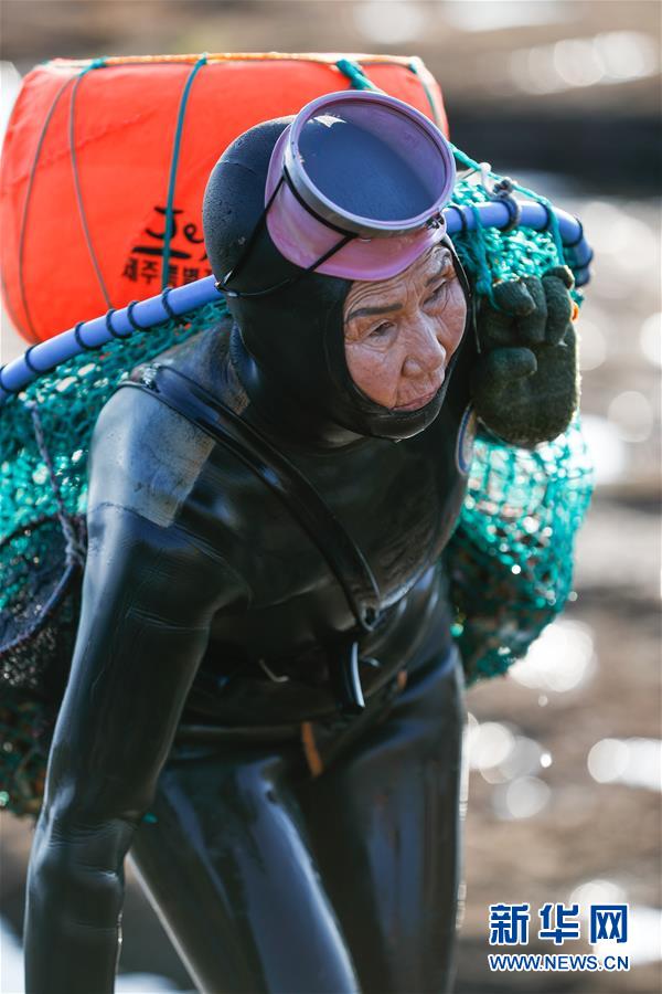 11月23日,一名海女在韓國濟州島的一處海岸附近結束作業(yè)后上岸。新華社記者王婧嬙攝