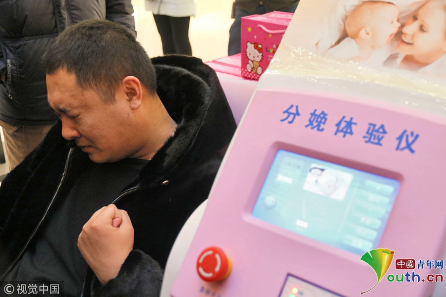 2018年3月8日,一名男士在山東煙臺(tái)大悅城通過“分娩體驗(yàn)儀”感受“分娩”時(shí)的陣痛。
