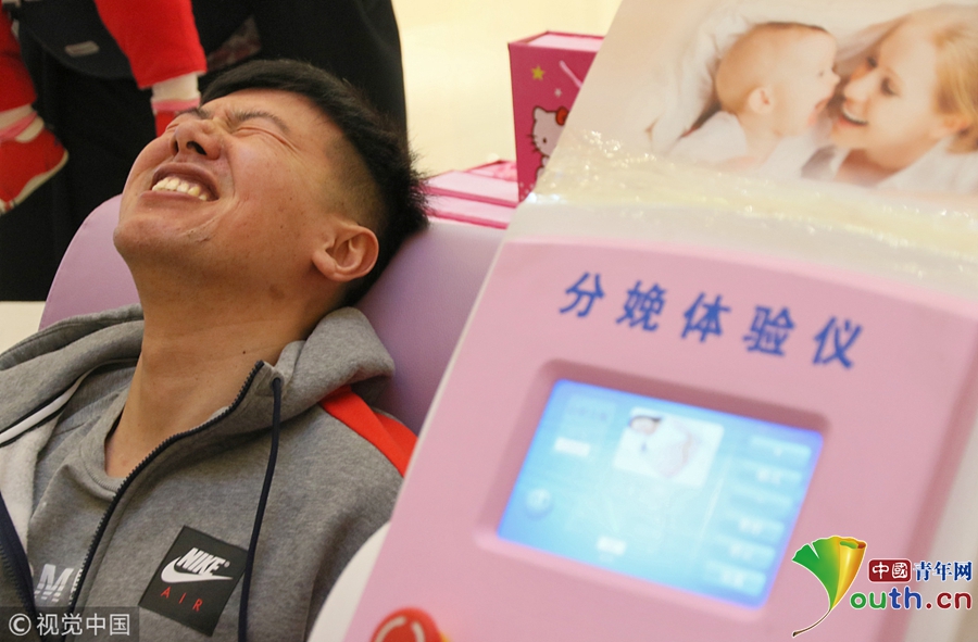 2018年3月8日,一名男士在山東煙臺大悅城通過“分娩體驗(yàn)儀”感受“分娩”時(shí)的陣痛。
