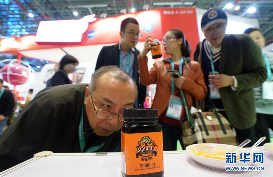 在首屆中國國際進(jìn)口博覽會(huì)上,參觀者在睦朋得野生蜂蜜有限公司展臺(tái)觀看蜂蜜展品(11月8日攝)。 新華社記者 程麗 攝