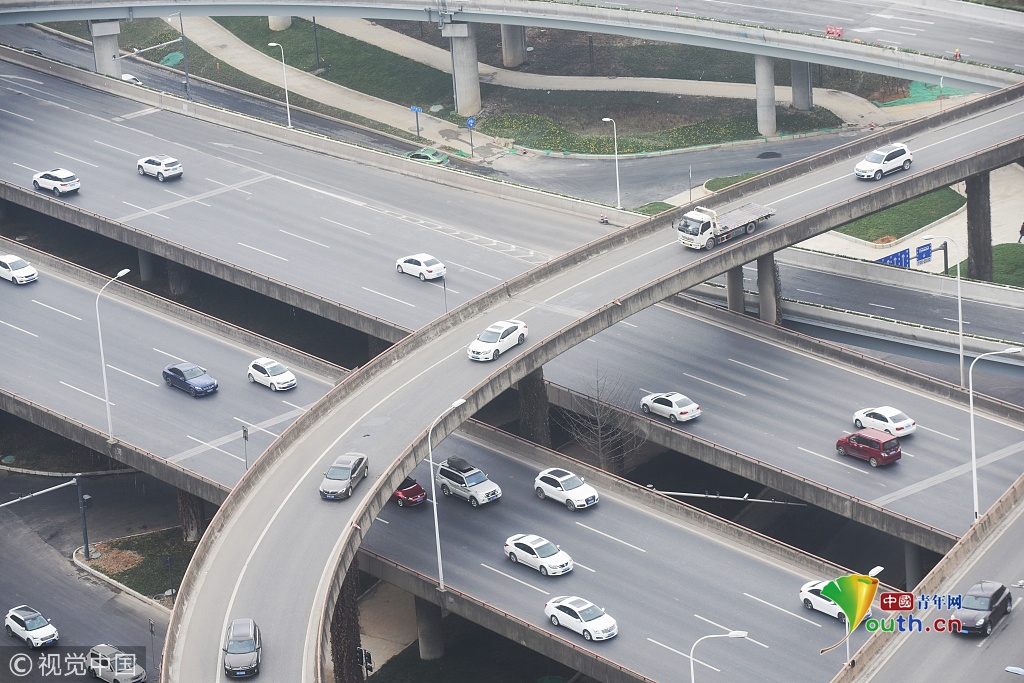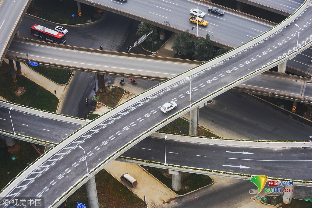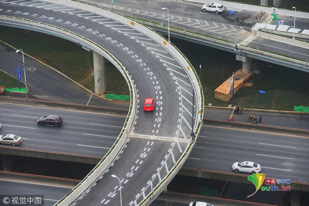 2018年11月23日,成都,俯瞰整個嬌子立交的全貌:12條匝道已經完工,道路標線、路面路況、指示牌都是全新的,不時有車輛在三環(huán)路和成龍路之間轉換。