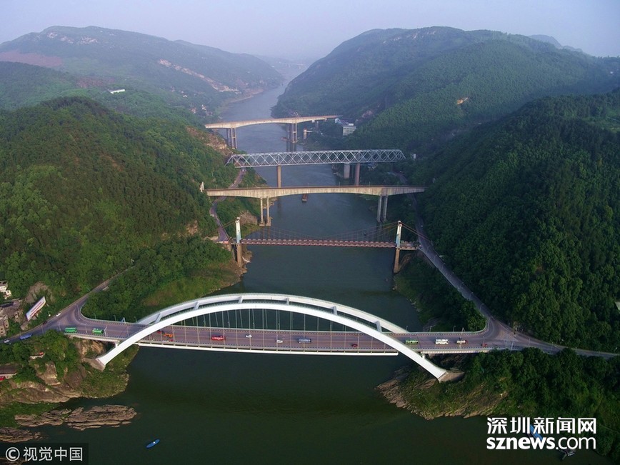 2018年5月18日,重慶,在嘉陵江重慶觀音峽段,間隔不到1000米的江面上橫跨著五座大橋,形成了五橋“疊翠”的美麗景觀,生動展示了“橋都”重慶的變化。 畫面中由近及遠分別是新朝陽橋、老朝陽橋、遂渝鐵路橋、襄渝鐵路橋、蘭渝鐵路橋。