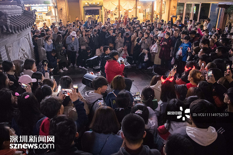 2018年4月6日晚,清明小長假的第二天,在山東省濟南市復古老街區(qū)寬厚里,暫停演出有段時日的網紅歌唱組合“連音社”悄然復出,吸引了當地以及來自全國各地游客的圍觀。