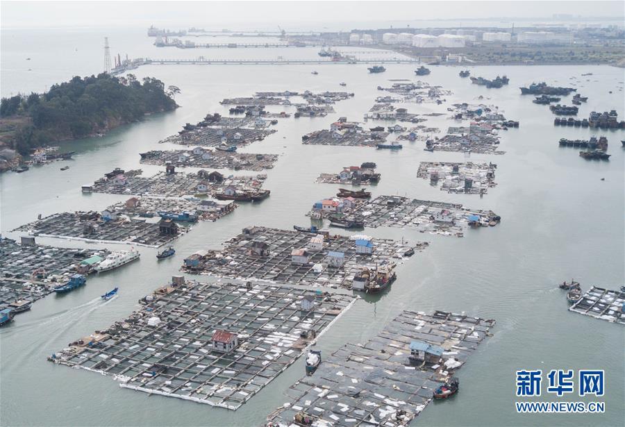 這是發(fā)生碳九泄漏事件的福建省泉州市泉港區(qū)南埔鎮(zhèn)肖厝村附近海域,漁排上鋪設(shè)了吸油氈(11月6日無人機(jī)拍攝)。