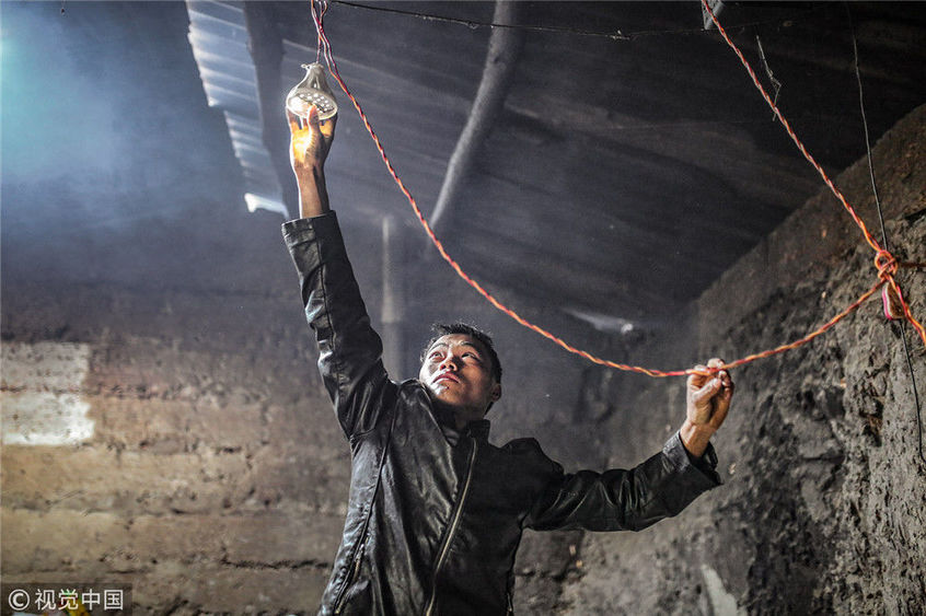 2018年11月,云南昆明。家里有個(gè)太陽(yáng)能的蓄電池,但燈光微弱。
