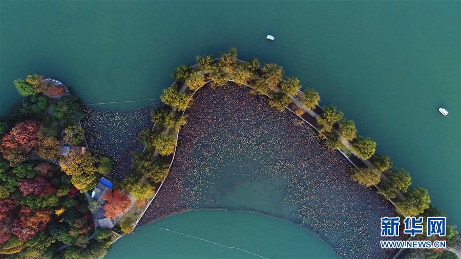兩只小船行駛在湖南烈士公園年嘉湖湖面(11月25日無(wú)人機(jī)拍攝)。新華社記者 李尕?cái)z