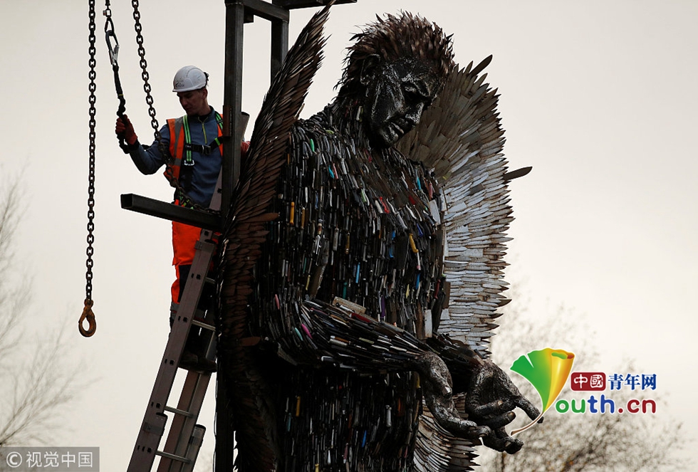 當(dāng)?shù)貢r(shí)間2018年11月29日,英國利物浦,藝術(shù)家阿爾菲·布拉德利在圣公會教堂外用沒收的10萬多把刀具制作了一尊名為“刀之天使”的塑像。
