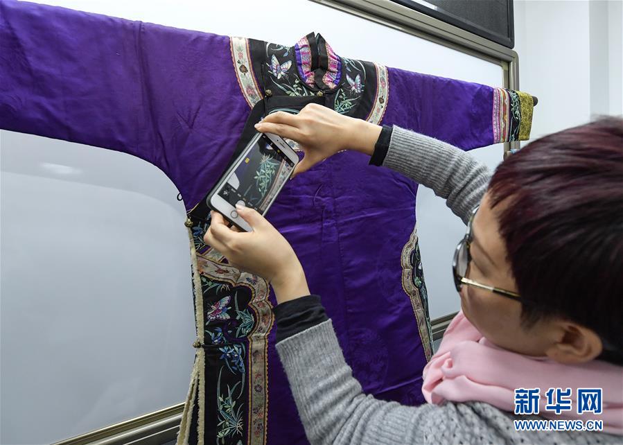 11月30日,在北京服裝學(xué)院,一名學(xué)生在拍攝清代女性服裝的細節(jié)。 新華社記者李賀攝