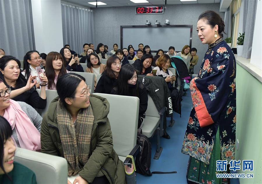 11月30日,畢紅(右一)在課堂上身著傳統(tǒng)服裝與師生們互動(dòng)。 新華社記者李賀攝