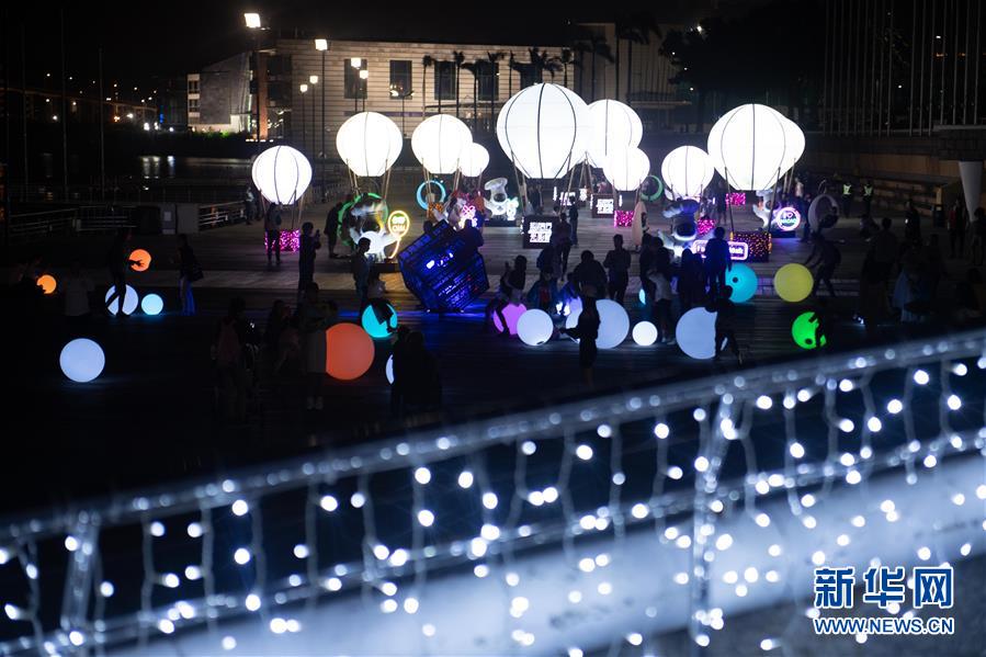 12月2日,人們在澳門南灣湖水上活動中心欣賞光影節(jié)裝置。