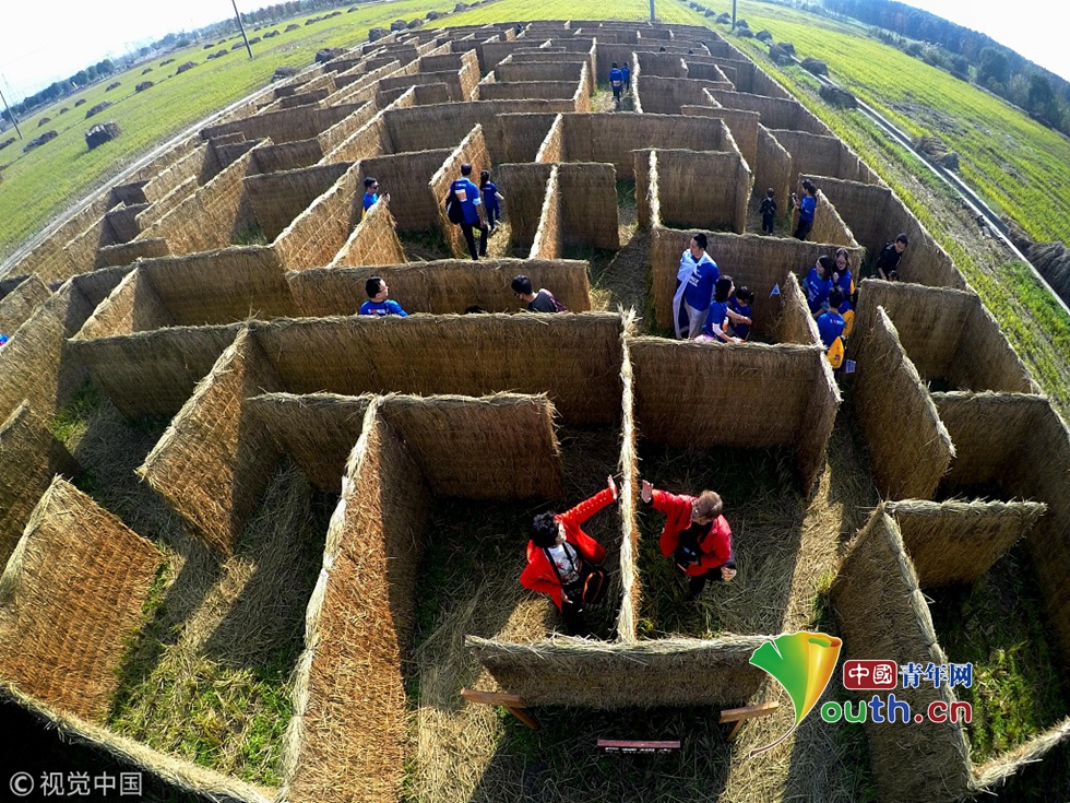 其中還有一個占地一畝多的稻田迷宮,游人穿梭在秸稈做成的迷宮里,別有一番獨(dú)特質(zhì)樸的樂趣。圖片來源視覺中國