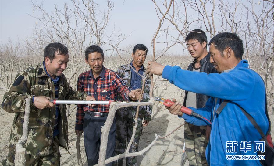 在拜什托格拉克鄉(xiāng)依提帕克吾斯唐村的棗地里,當?shù)卮迕駥W習修剪棗樹枝條(3月19日攝)。 新華社發(fā)