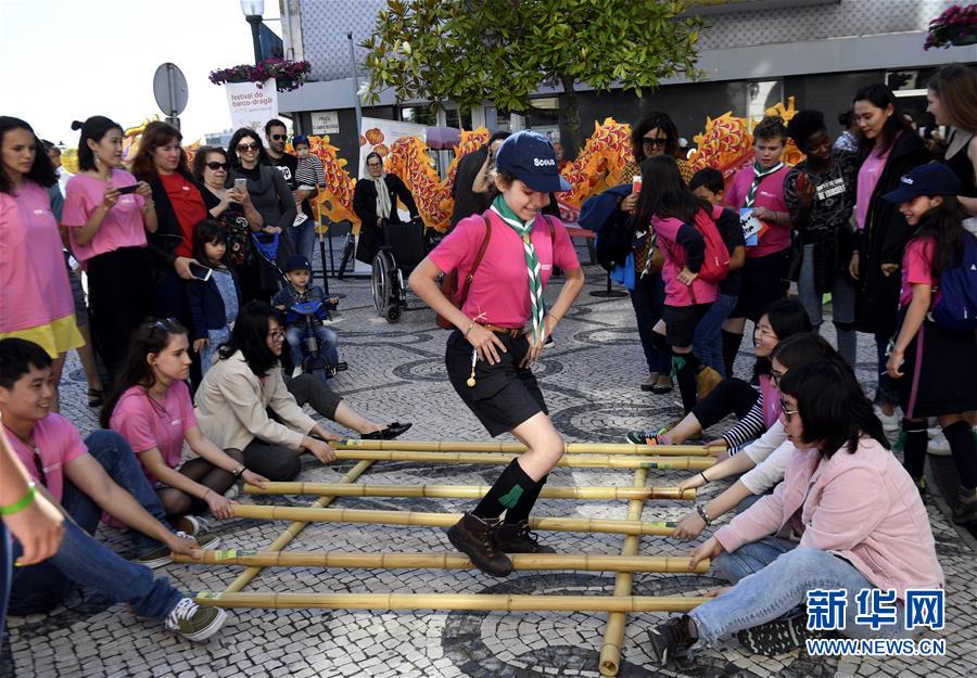 2018年6月16日,在葡萄牙阿威羅舉行的端午龍舟巡游活動(dòng)開幕式上,阿威羅大學(xué)孔子學(xué)院的學(xué)生表演竹竿舞。 位于伊比利亞半島西南部的歐洲古國(guó)葡萄牙,山清水秀、風(fēng)景如畫。它東、北連接西班牙,西、南瀕臨大西洋。葡萄牙現(xiàn)有人口1029.1萬,國(guó)土面積約9.22萬平方公里,首都為里斯本,官方語言為葡萄牙語。 新華社記者張立云攝