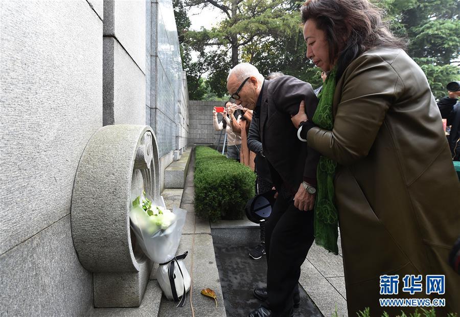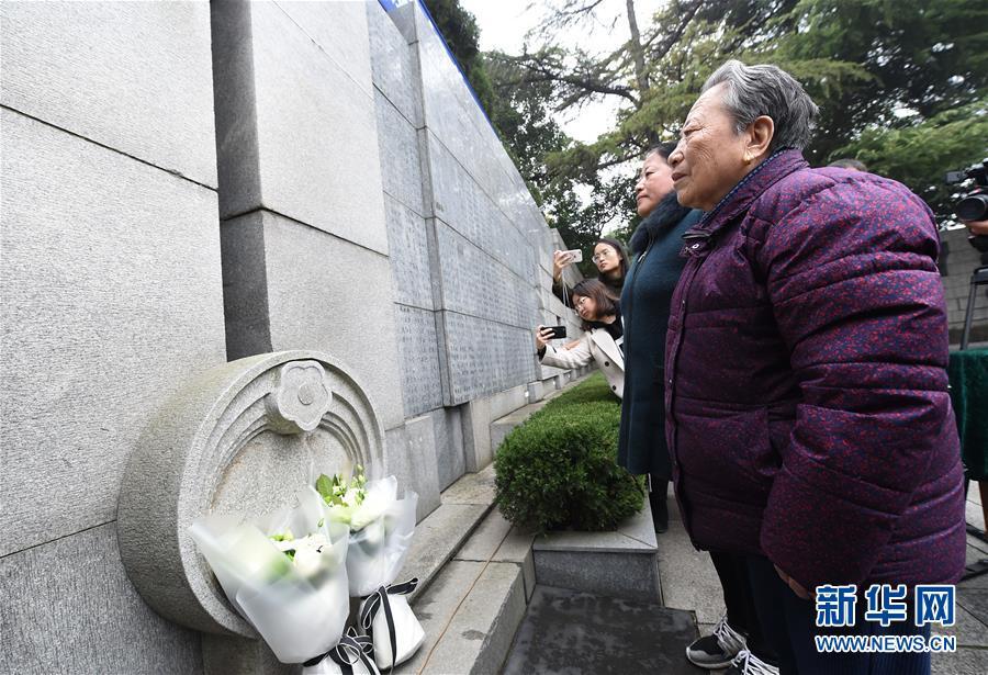12月3日,南京大屠殺幸存者石秀英(右)率家屬在死難者名單墻前憑吊被侵華日軍殺害的親人。 當日,在第五個南京大屠殺死難者國家公祭日到來之際,南京大屠殺死難者遺屬家祭活動在侵華日軍南京大屠殺遇難同胞紀念館正式啟動。首批前來開展家祭活動的南京大屠殺幸存者余昌祥、石秀英老人分別率家屬在紀念館內(nèi)的死難者名單墻前獻花、敬香、跪拜,并誦讀家信,表達對親人的哀思。 新華社記者 孫參 攝