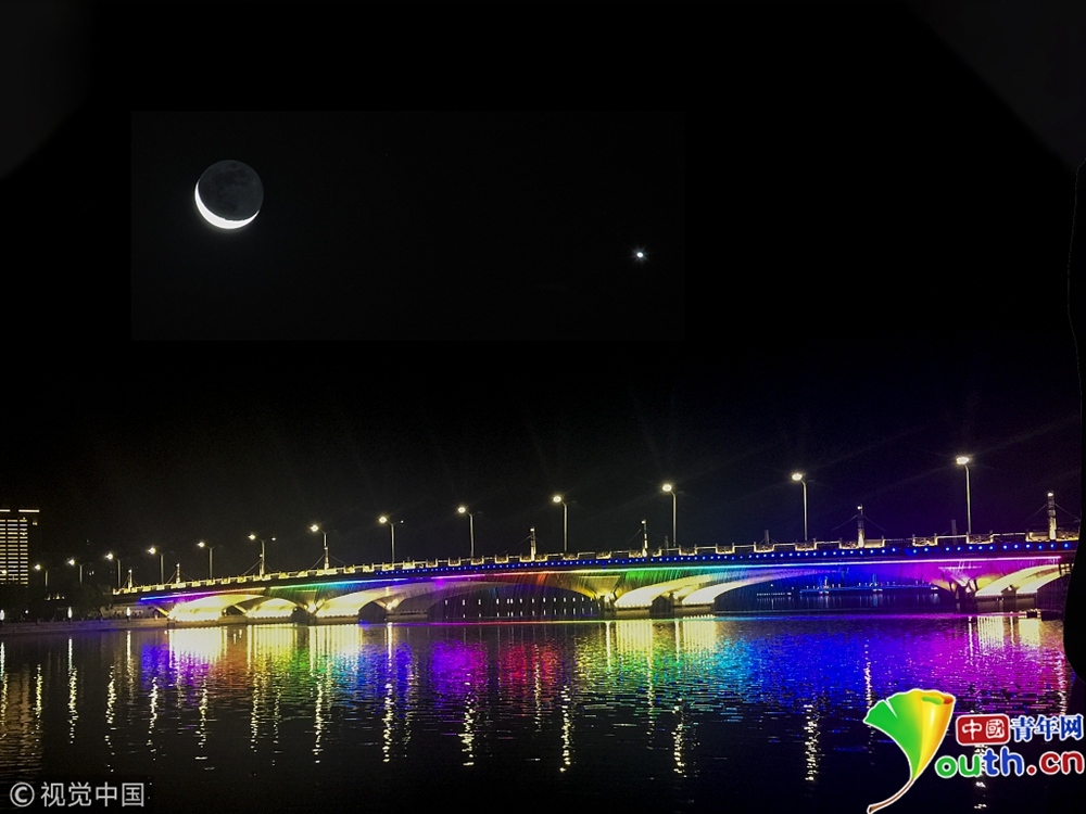 北京市通州區(qū),早上東南方天際上演“金星合月” 美麗景象。