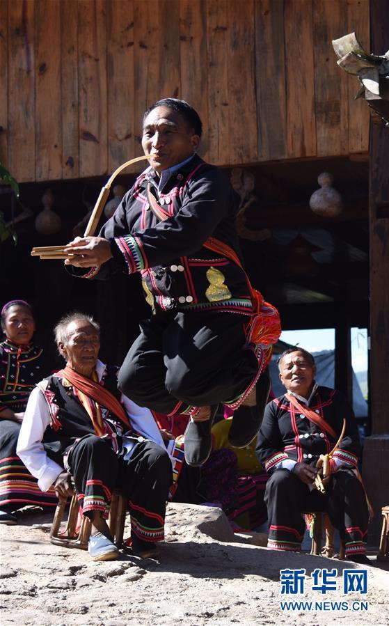 12月4日,在云南省瀾滄拉祜族自治縣酒井鄉(xiāng)勐根村老達(dá)保寨,拉祜族蘆笙舞傳承人李石開在表演蘆笙舞。 新華社記者張瑞琪攝