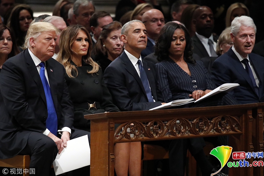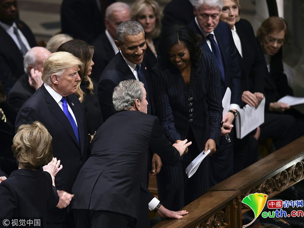 布什家族成員、現(xiàn)任總統(tǒng)特朗普、前總統(tǒng)奧巴馬等美國政界人士以及多名國際政要出席,為老布什送行。