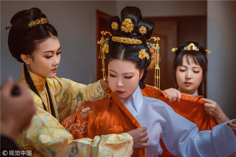 2018年11月18日,浙江嘉興。女孩黃聰今年30歲,是浙江省海寧市硤石人,是一位對漢文化情有獨鐘的個性女孩。對于這一次的漢婚大禮的每一個細節(jié),都非常仔細。小到發(fā)簪首飾,大到日常禮儀。說起為什么會舉辦這樣一場古風婚禮,她說自己從2013年戀上漢服,就下了這個決定。