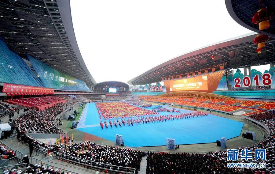 12月10日,廣西壯族自治區(qū)成立60周年慶祝大會(huì)在廣西體育中心隆重舉行。這是慶祝大會(huì)上的群眾文藝表演。 新華社記者 陳建力 攝
