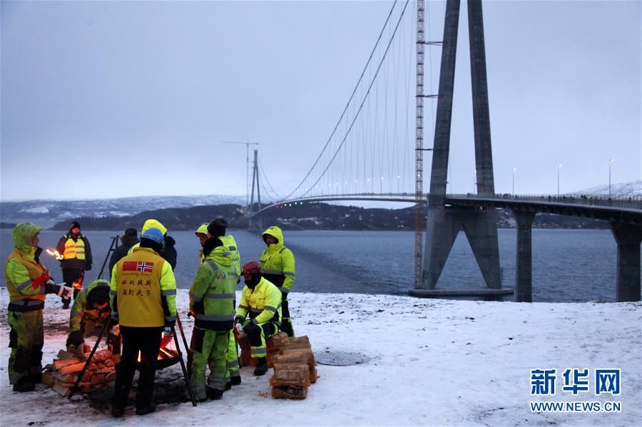12月9日,中國(guó)工人在挪威哈羅格蘭德大橋旁烤火取暖。 新華社記者梁有昶攝