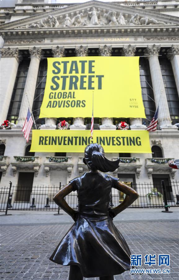 這是12月10日在美國紐約證券交易所前拍攝的“無畏女孩”銅像。 新華社記者 王迎 攝