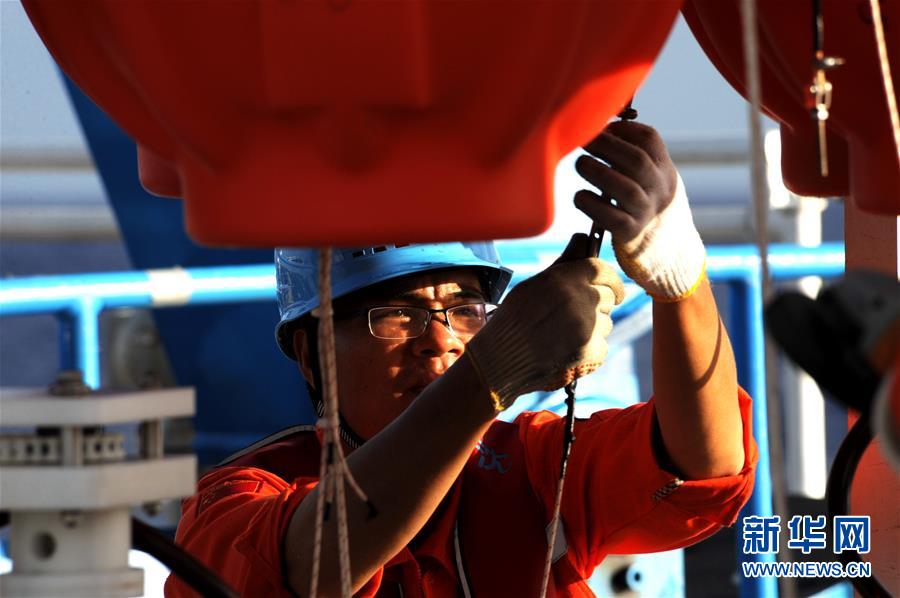 考察隊(duì)員在布放“彩虹魚”著陸器前進(jìn)行檢查工作(12月10日攝)。 由上海海洋大學(xué)和西湖大學(xué)聯(lián)合組成的“彩虹魚”科考團(tuán)隊(duì),12月11日在全球最深的海溝——馬里亞納海溝成功完成兩臺(tái)“彩虹魚”第二代著陸器的萬米級海試,深度分別為10918米和10899米。 新華社記者 張建松 攝