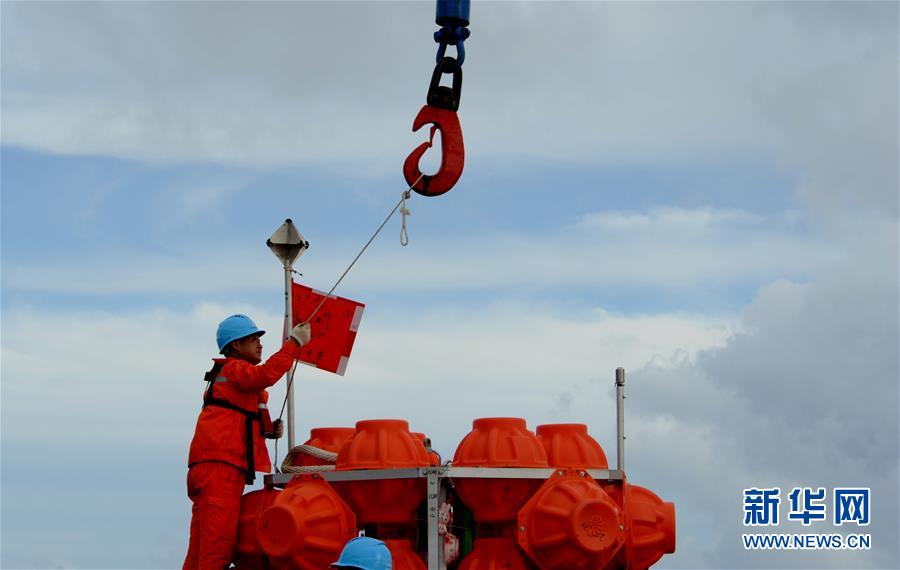考察隊(duì)員對“彩虹魚”著陸器進(jìn)行掛鉤作業(yè)(12月10日攝)。 由上海海洋大學(xué)和西湖大學(xué)聯(lián)合組成的“彩虹魚”科考團(tuán)隊(duì),12月11日在全球最深的海溝——馬里亞納海溝成功完成兩臺(tái)“彩虹魚”第二代著陸器的萬米級海試,深度分別為10918米和10899米。 新華社記者 張建松 攝