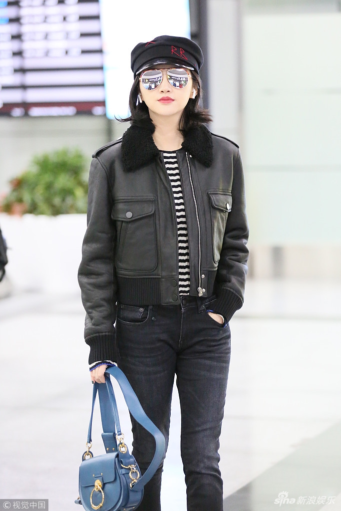 日前,景甜現(xiàn)身機(jī)場(chǎng),身穿黑色皮夾克超有范兒,戴小帽酷似甜美女軍官。視覺中國(guó)/圖