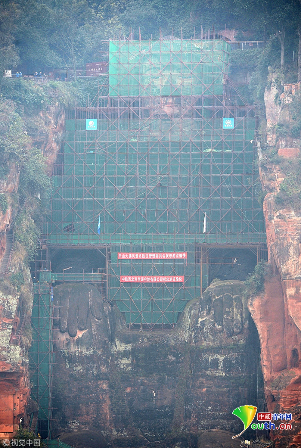 12月10日前后已逐步遮蔽大佛頭部,對頭面部進(jìn)行勘測;12月底將開始拆除頭部腳手架,保證2019年元旦節(jié)之前,先露出佛頭,供游客觀賞。