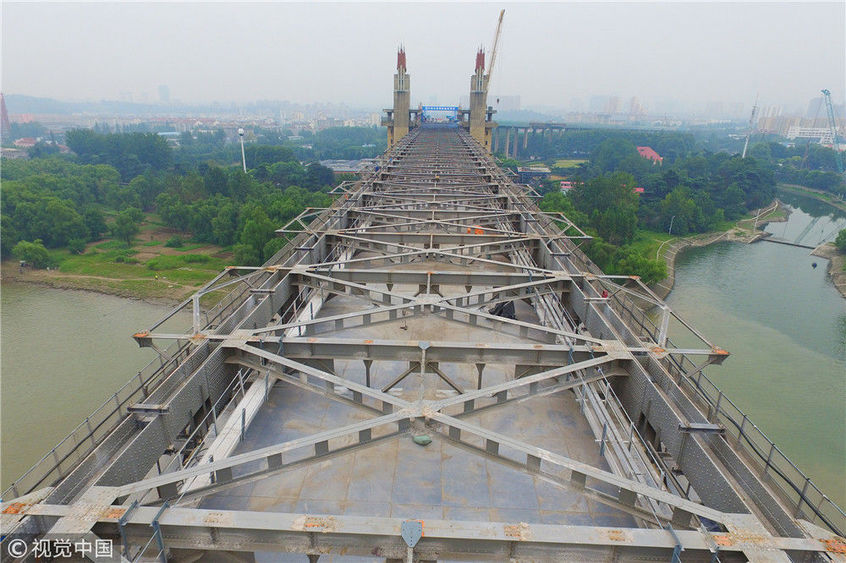 2017年9月19日,南京長(zhǎng)江大橋正橋的混凝土面板已經(jīng)全部拆除,僅剩交錯(cuò)縱橫的鋼桁架橫跨在長(zhǎng)江之上,從高空俯瞰猶如一條“鋼鐵巨龍”。