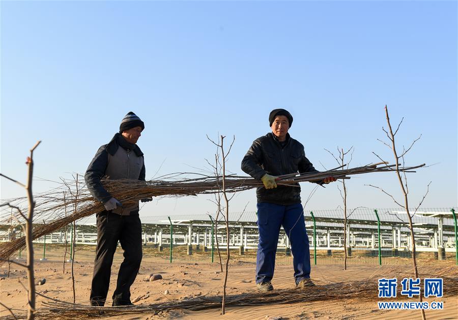 12月13日,位于庫布其沙漠腹地的達拉特光伏發(fā)電應用領跑基地一期500兆瓦項目中,工人用柳枝制作固沙帶。 新華社記者 彭源攝